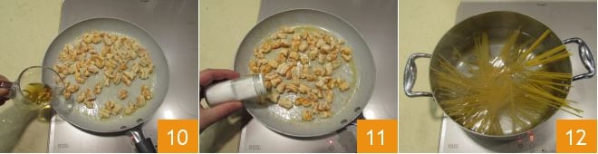 Deglaze with brandy and let it evaporate 10, seasoning with salt 11 and pepper. Cook the pasta 12.