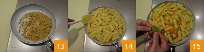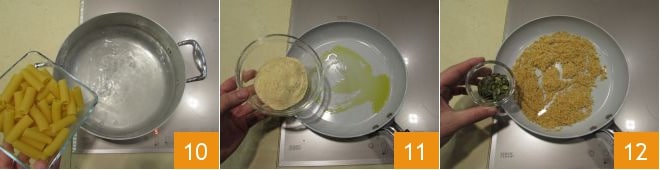 When the water is boiling, add salt and cook the pasta 10; in the meantime, proceed to toast the breadcrumbs. Take a non-stick pan with a wide bottom in which you will pour 2 teaspoons of oil. Heat it and add the breadcrumbs 11, stir and let it brown for a few moments, then also add the pumpkin seeds 12.