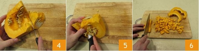 Cut it into slices 4 and remove the strings and seeds inside 5. Then cut the slices further into evenly sized cubes to ensure even cooking 6. At this point, heat a pot with plenty of salted water that you will use to boil the pasta.