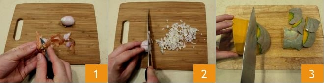 To prepare the pasta with pumpkin and breadcrumbs, start by cleaning 1 and finely chopping the shallot, which you will set aside 2. Then proceed to clean the pumpkin: remove the skin 3.