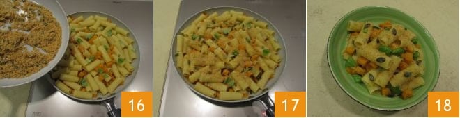 Finally, add the toasted breadcrumbs with the pumpkin seeds 16 and mix the ingredients again to blend the flavors 17. Now your pasta with pumpkin and breadcrumbs is ready to be served and enjoyed 18!