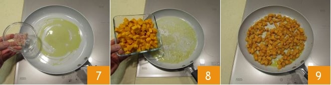 Take a non-stick pan with a wide bottom in which you will sauté the chopped shallot with 3.5 tablespoons of oil over low heat 7, stirring often to prevent it from burning: it will take about 5 minutes. Once it is golden, add the pumpkin 8 and cook it over low heat, adding hot water (the pasta cooking water will do) if the pumpkin dries out too much during cooking. It will take about 15 minutes over moderate heat to get soft pumpkin cubes that do not fall apart 9. Finally, adjust the seasoning with salt and pepper.