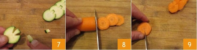 extract the triangles to get the shape of a cute pumpkin 7. Repeat the same procedure with the carrots: peel them, trim, then cut into slices 0.2 inches thick 8, carve the triangles with a knife 9