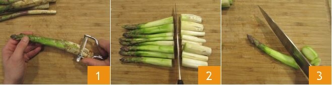 To prepare pasta with ricotta cream, asparagus, and pistachios, first take care of cleaning the asparagus: peel them while leaving the tips intact and removing the lower white part 2, which is the toughest. Cut them into crosswise slices 3