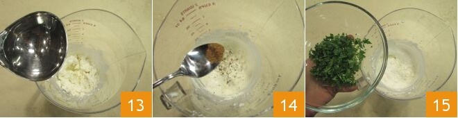 then add a couple of ladles of pasta cooking water 13 to make the cream smoother and more velvety. Salt, pepper, and season with nutmeg 14. Finally, flavor with freshly chopped parsley 15.