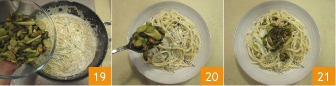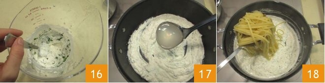 Stir the cream 16 and pour it into a large pot, add another 2 ladles of pasta cooking water 17; then directly drain the pasta into the pot 18.