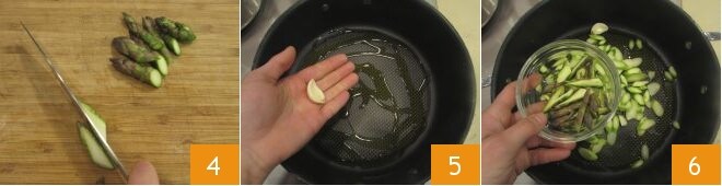 and split the tips in half lengthwise 4. Place a pot filled with salted water on the stove, which will be used to cook the pasta. In a large pan, heat olive oil with a garlic clove 5, and as soon as it starts to sizzle, add the asparagus 6