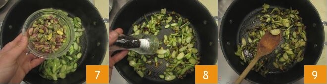 and the pistachios 7, cook over medium heat for 5 minutes, stirring often. Then salt, pepper 8, remove the garlic clove 9, and set aside.