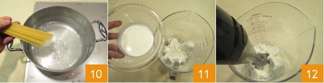 Meanwhile, cook the pasta in boiling water for the time indicated on the package. Continue with the dressing: in a pitcher (or a tall glass for a mixer), pour the ricotta, the fresh liquid cream 11, blend the mixture with an immersion blender 12,