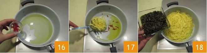 At this point, take a chili pepper, remove the seeds, and cut it into strips. Pour a drizzle of oil into another pan and add the chili pepper 16. When the pasta is al dente, drain it directly into the pan with the chili pepper 17 and add the tapenade 18.