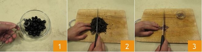For the preparation of the pasta with tapenade and mackerel, start by preparing the Tapenade. Pit the olives 1 and finely chop them with a knife 2. Then drain the anchovies from the preservation oil and chop them as well 3.