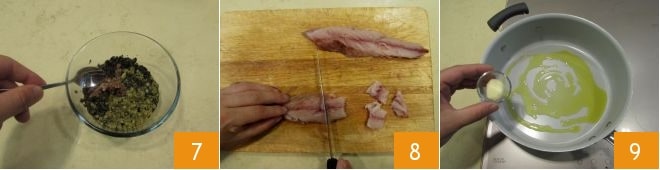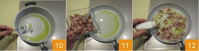 When golden, remove it 10 and add the mackerel pieces 11, season with salt 12 and pepper.