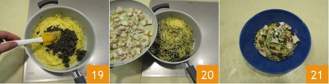 Mix the ingredients well 19. Then also pour in the mackerel 20 and plate your pasta with tapenade and mackerel 21!
