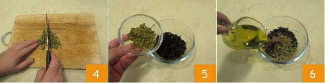 Finally, rinse the capers gently under running water, then pat them dry with a paper towel and finely chop them 4. The ingredients for the tapenade are ready: pour the olives, capers 5, anchovies into a bowl, and add the oil 6.
