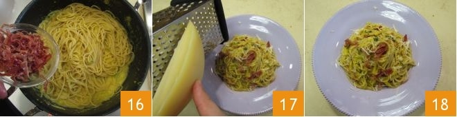 At this point, you can add the strips of prosciutto 16, season with grated caciocavallo cheese 17 and thyme leaves, and serve the pasta with prosciutto and yellow zucchini immediately 18.