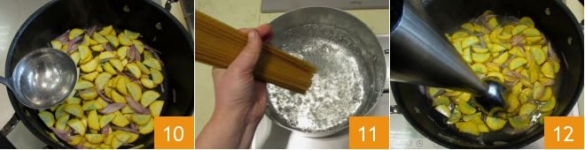 Cook over moderate heat for 10 minutes, adding pasta cooking water as needed 10 to prevent the mixture from drying out. When the zucchinis are almost ready, pour the spaghetti into the pot 11 and cook for the time indicated on the package. When the zucchinis are tender, puree them with an immersion blender 12.