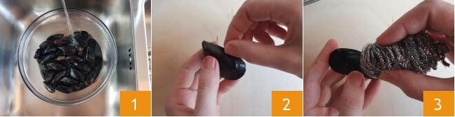 To prepare the pasta with zucchini, mussels, and pecorino, first start by cleaning the mussels: rinse the mussels under running water 1, discard any that are open or with broken shells, remove the byssus 2, or the beard found on each mussel, by pulling it off with your fingers, scrub the shells of the mussels with a steel wool pad 3 to remove impurities and rinse them again under running water.