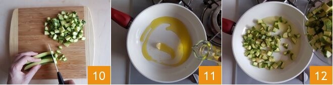 Meanwhile, place a pot with plenty of slightly salted water on the stove to cook the pasta. Prepare the sauce: wash and trim the zucchini, then cut them first into sticks and then into cubes of about half an inch 10. Pour the oil into a pan, add the peeled garlic clove 11, and let it become golden, add the zucchini 12,