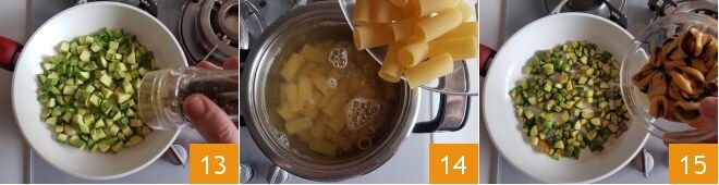 and season with a grind of pepper 13, there is no need to salt, the pecorino and mussels will provide the right saltiness), cook over high heat for about 5 minutes, stirring frequently, the zucchini should turn golden. Meanwhile, cook the pasta al dente 14 Once the zucchini are well browned, remove the garlic, add the mussels 15