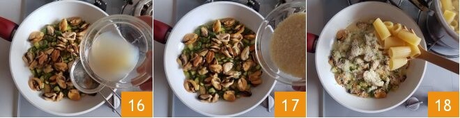 and their filtered cooking water through a sieve 16, sauté for a couple of minutes and season with ¾ of the pecorino 17. Drain the cooked pasta into the pan 18,