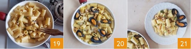 stir to combine the ingredients 19. The pasta with zucchini, mussels, and pecorino is ready 20, serve it hot with more pecorino and some mussels with shells that you set aside 21.