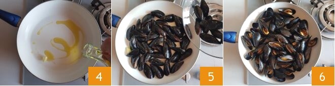 Pour a drizzle of oil into a pan with a peeled garlic clove 4, as soon as the garlic is slightly golden, add the mussels 5, cover with a lid, and let them open over high heat (it will take about 5 minutes). Once all the mussels have opened, turn off the heat and let them cool down 6.