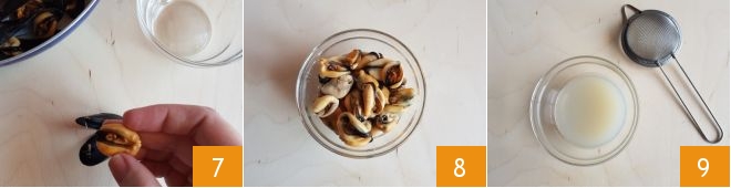 Shell the mussels 7 and place them in a bowl 8, leaving a small portion with the shell for the final decoration of the dish, also save the filtered cooking water 9.