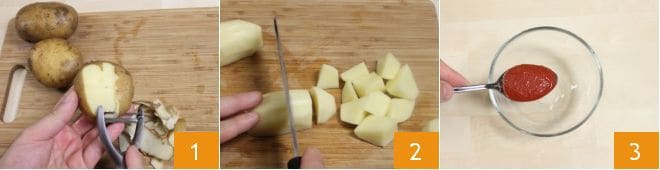 To make patatas bravas, wash and peel the potatoes with a peeler or paring knife 1, cut them into small chunks 2, and set them aside. In a small bowl, place the tomato sauce 3