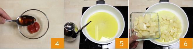 and the vinegar 4, mix the sauce and keep it for seasoning the potatoes. In a large skillet, pour the olive oil 5, then add the potato wedges 6
