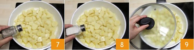 pepper 7, salt 8, and fry the potatoes for 5 minutes. Then cover with a lid 9, lower the heat, and cook for about another 20 minutes, checking the cooking occasionally and stirring the potatoes with a spoon, being careful not to break them.