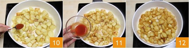 After this time, flavor the potatoes with paprika 10, increase the heat, add the tomato sauce with red wine vinegar 11, and cook for another 3 minutes to let the sauce absorb. Now your patatas bravas are ready 12 to be enjoyed as in Spain: serve them in small terracotta bowls skewered with toothpicks, they will be a hit!