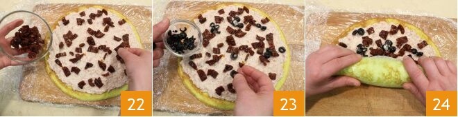the sun-dried tomatoes 22 and the black olives 23. Roll up the omelet 24,