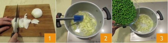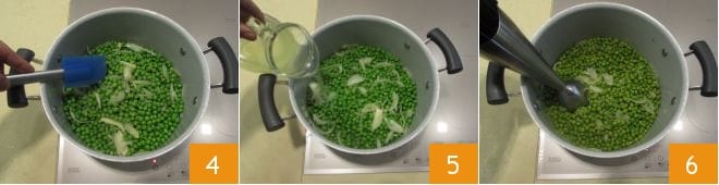 To prepare the pea velouté, start by preparing the Vegetable broth. When it's ready, peel the onion, then slice it 1; in a saucepan, heat the oil slightly over low heat and add the onion 2. Let the onion sweat slightly over low heat, stirring often to prevent it from burning. Then add the peas (whether you use fresh or frozen peas, the procedure will be the same) 3,