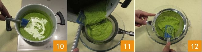 turn the heat back on and continue cooking for another 5 minutes, stirring often 10. Transfer your pea cream into a sieve 11 and strain it with the help of a spatula to make it even creamier 12.