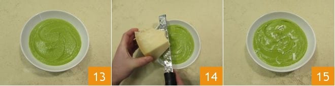 Plate your pea velouté 13 and garnish it with some Grana Padano flakes to taste 14 before serving it hot or warm as you prefer 15!