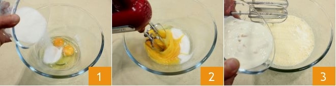 To prepare the skillet cake, start by beating the eggs with the sugar using an electric mixer (1-2); when the eggs are well beaten and frothy, add the yogurt to the mixture 3.
