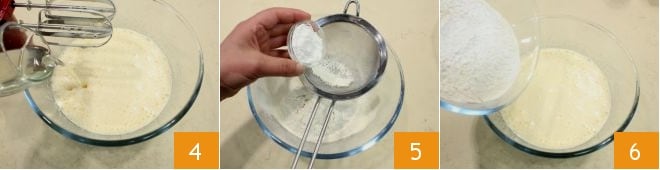 Also pour in the vegetable oil 4 and continue to work the batter. In a separate bowl, sift the flour along with the baking powder 5 and gradually add the dry ingredients to the batter 6.