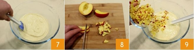Mix carefully with a spatula 7; then cut the peach into small pieces 8 and fold it into the batter 9.