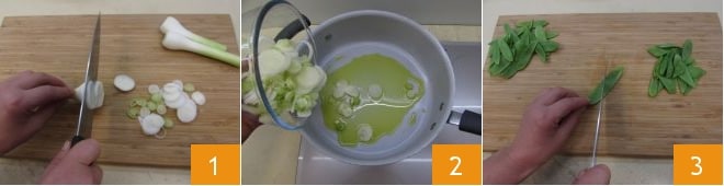 To prepare the penne with smoked salmon and snow peas, start by cleaning the scallion and slicing it into rings 1. Pour the oil into a pan, add the scallion 2, and let it simmer for about 6-7 minutes on very low heat. Meanwhile, wash the snow peas and cut them in half, making an oblique cut 3.