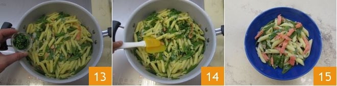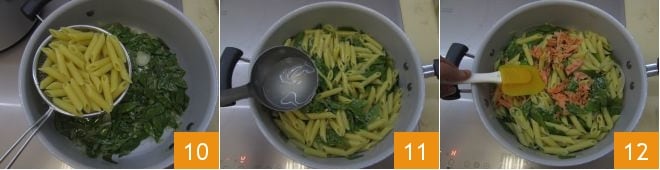 Set aside some of the cooking water, drain the pasta al dente, and add it directly to the pan with the snow peas 10, finishing cooking by adding a ladle of the pasta cooking water 11. Then also add the salmon strips 12.
