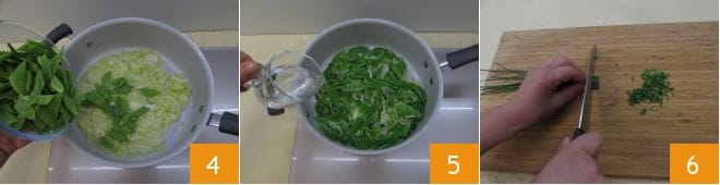 Once the scallion has softened, add the snow peas 4, season with salt and pepper, and cook for 7-8 minutes. Then add 100 ml of water or Vegetable broth 5 and finish cooking the snow peas until it evaporates. Chop the chives and set them aside 6.