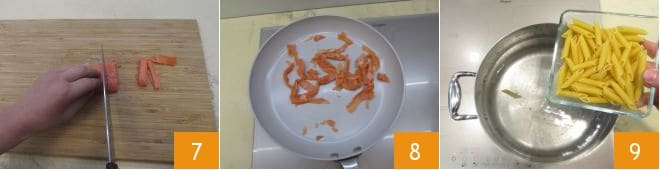 Cut the salmon into strips 7 and place them in a preheated non-stick skillet. Cook for about 2-3 minutes until crispy 8. Meanwhile, cook the pasta in plenty of boiling water, salted to taste 9.