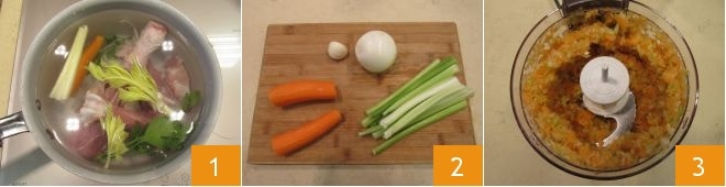 To prepare the penne with turkey ragù, start with the broth, which you can make using the bones. So in a large pot, pour in water, celery, carrot, onion, parsley, salt, and, of course, the turkey bones 1 and let it cook for a couple of hours on low heat, skimming occasionally. This broth will be useful for cooking the ragù. If you don't have turkey bones, you can replace them with vegetable broth. For the ragù, clean the celery, carrot, onion, and garlic 2 and blend them at high speed for a few moments to obtain small cubes 3.
