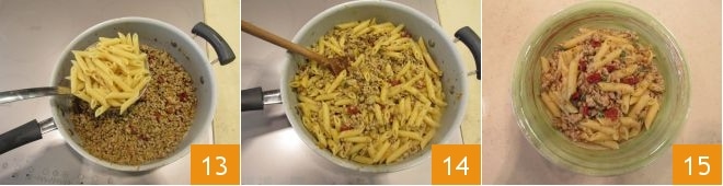 and once it is al dente, drain it and add it to the sauce 13. Stir and let it cook for a few more moments so that the pasta absorbs the flavor 14, and finally serve your penne with turkey ragù while they are still very hot, garnishing with a few thyme leaves 15!
