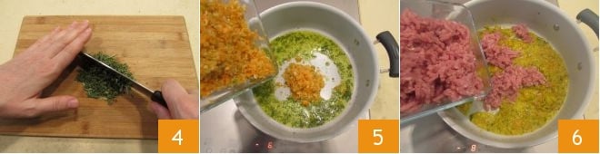 On a cutting board, finely chop the aromatic herbs 4 and add them to a saucepan with the oil along with the aromatic mixture 5. Cook for about ten minutes. Once the base is well-flavored, add the ground turkey meat 6,