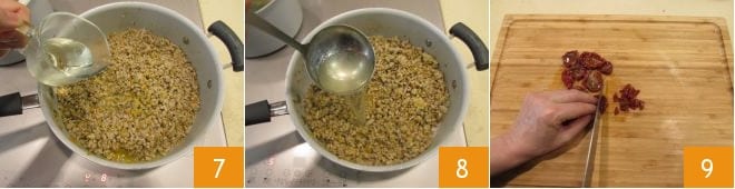 stirring occasionally to prevent burning, and after fifteen minutes, deglaze with white wine 7. Once the alcohol has completely evaporated, add about 1 1/4 cups (300 ml) of broth, prolonging the cooking for another 15 minutes 8. Chop the sun-dried tomatoes in oil 9