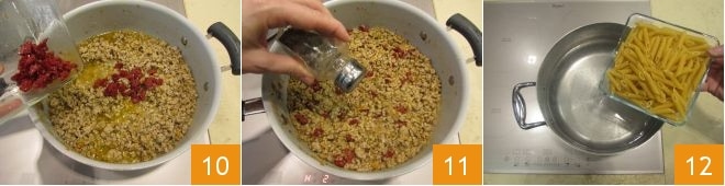and add them to the ragù 10, then adjust the salt and pepper 11. Meanwhile, cook the pasta in plenty of boiling salted water 12