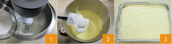 For the Peppa Pig cake, start with the Sponge cake: separate the egg whites from the yolks and beat the yolks with half of the sugar to obtain a frothy, puffy, and light yellow mixture (using a whisk or stand mixer). Also, beat the egg whites until glossy, and after about 5 minutes, when they are already quite puffy and white, add the remaining sugar 1. Combine the whipped egg whites with the whipped yolks 2 and mix to combine the ingredients; add the sifted flour and potato starch along with the seeds from the vanilla bean. Mix everything with a wooden spoon until you get a homogeneous mixture, being careful not to deflate it; butter and flour an 11x14 inch pan 3 and bake in a preheated static oven at 350°F for 25 minutes.