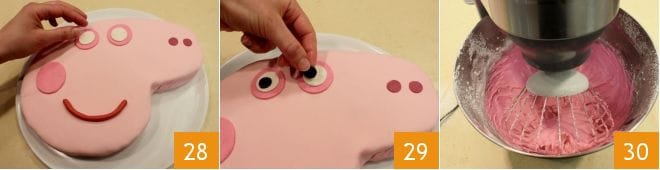 Attach the nose, mouth, and whites of the eyes 28, finish with the pupils 29. Make the royal icing: in the mixer bowl, work the egg white and powdered sugar and gradually add food colors to achieve the right dark pink tone 30.