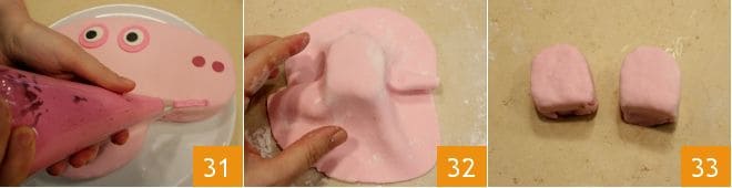 Pour the royal icing into a pastry bag with an oblique nozzle and make the edge of Peppa Pig's snout and nose 31. Then fill the ears with custard cream or apricot jam, then cover them with pink sugar paste, removing the excess (32-33).
